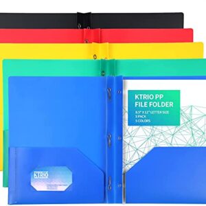 KTRIO Plastic Pocket Folders with Prongs, 5 Pack 2 Pocket Folders 3 Prong Folders with Pockets and Brads Heavy Duty Letter Size Colored Plastic Folders with Pocket and Prong for School Office Home